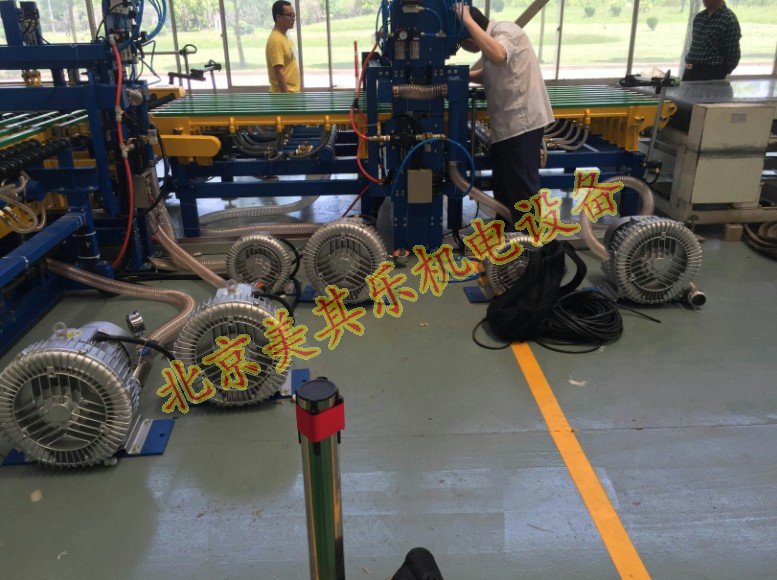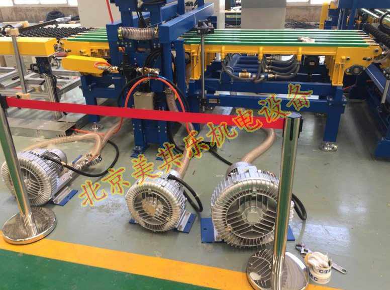玻璃傳送高壓鼓風機,在此設備上的作用是,在整體流水線傳輸過程中,由玻璃傳輸專用高壓鼓風機提供一定的吸力,通過PVC管鏈接至履帶,因履帶上有很多規則的小孔,所以能通過吸力固定住玻璃,也可以對玻璃進行清洗、打磨、上色等,對玻璃不產生任何影響,沒有任何的痕跡,此類風機也常用于磨邊機,氣浮臺等,原理相同。